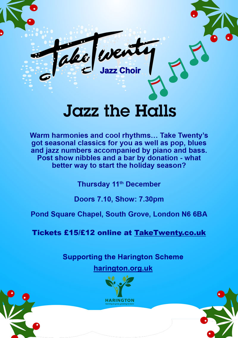 Warm harmonies and cool rhythms ... Take Twenty's got seasonal classics for you as well as pop, blues and jazz numbers accompanied by piano and bass. Post show nibbles and a bar by donation - what better way to start the holiday season?